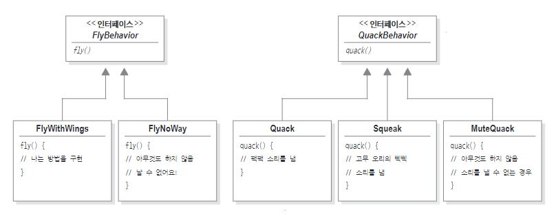 우선 Duck 클래스에 flyBehavior와 quackBehavior라는 인터페이스 형식의 변수를 추가하고 각 오리 객체에선 실행 시 이 변수에 특정 행동 형식의 레퍼런스를 다형적으로 설정합니다.