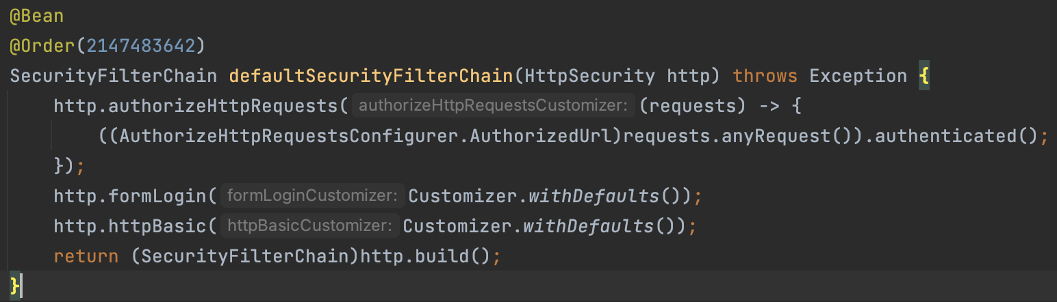 그 중에서 직접 재정의를 하지 않으면 SpringBootWebSecurityConfiguration 클래스에 있는 defaultSecurityFilterChain의 기본 설정을 따라갑니다.