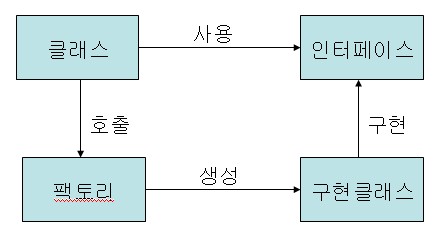 팩토리가 구현클래스를 생성하기 때문에 호출은 팩토리를 호출하는 것만으로 충분하다.