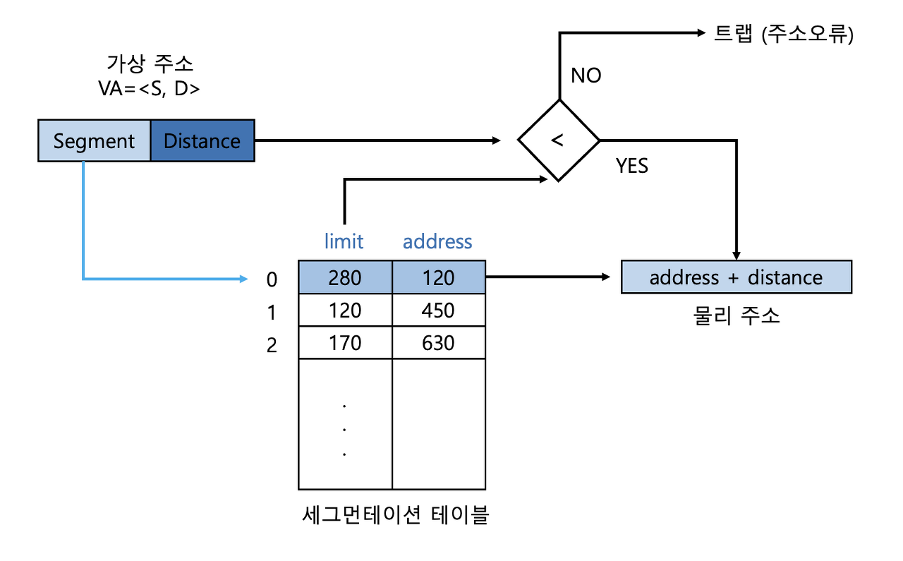 - 세그먼테이션 테이블에서 원하는 세그먼트의 address를 알아낸 후 시작 주소에 D(거리)를 더해 물리 주소를 구한다.