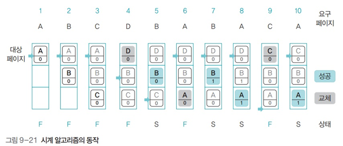 - 참조 비트의 초깃 값은 0, 메모리에 있는 페이지를 성공적으로 참조하면 1로 변경한다.