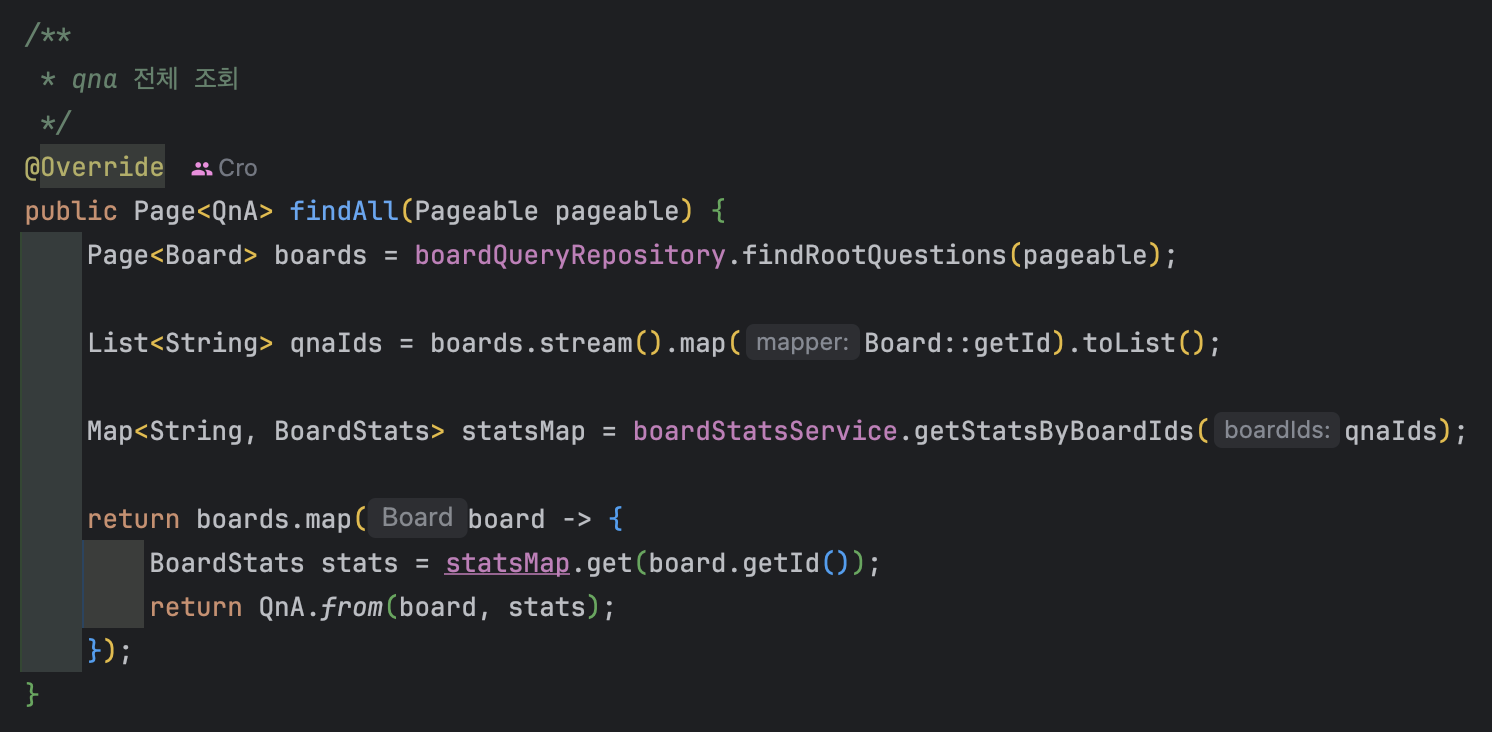 결과를 담을 Map과 캐시 미스된 id를 담을 List를 미리 선언하고, 캐시에 있으면 도메인 객체로 변환해서 resultMap에 담아주고 캐시에 없으면 missedQnaIds에 추가하여 fallBack 전략으로 처리하였습니다.