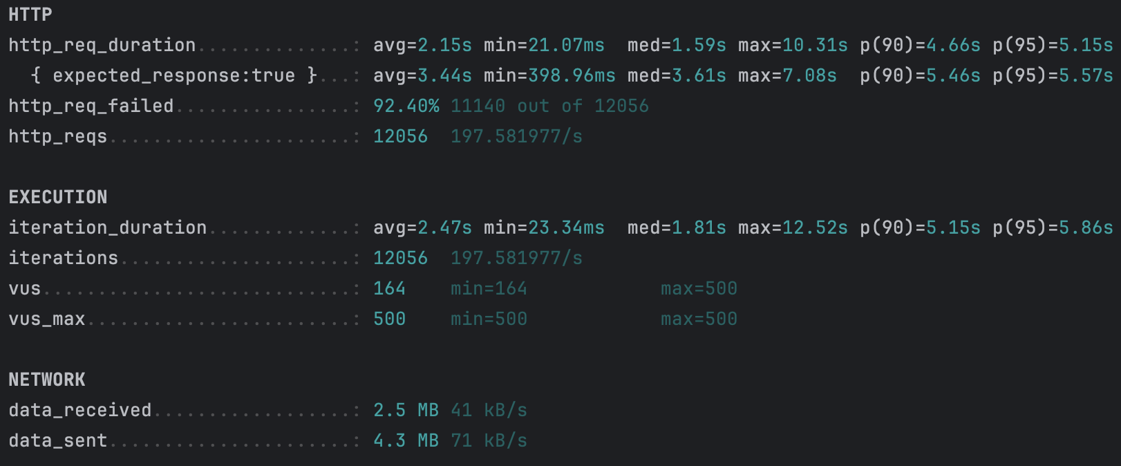 평균 응답 시간은 2.15초였지만, p95 지표가 5.15초까지 올라 일부 요청에서 큰 지연이 발생했다.