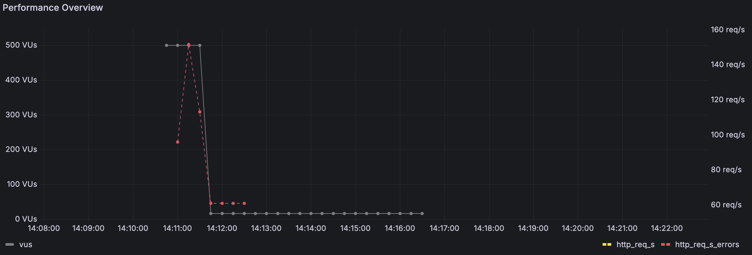 요청 처리량 자체는 이전보다 낮아졌지만, 요청과 실패 요청의 흐름이 크게 흔들리지 않고 비교적 일정한 패턴으로 유지된다.
