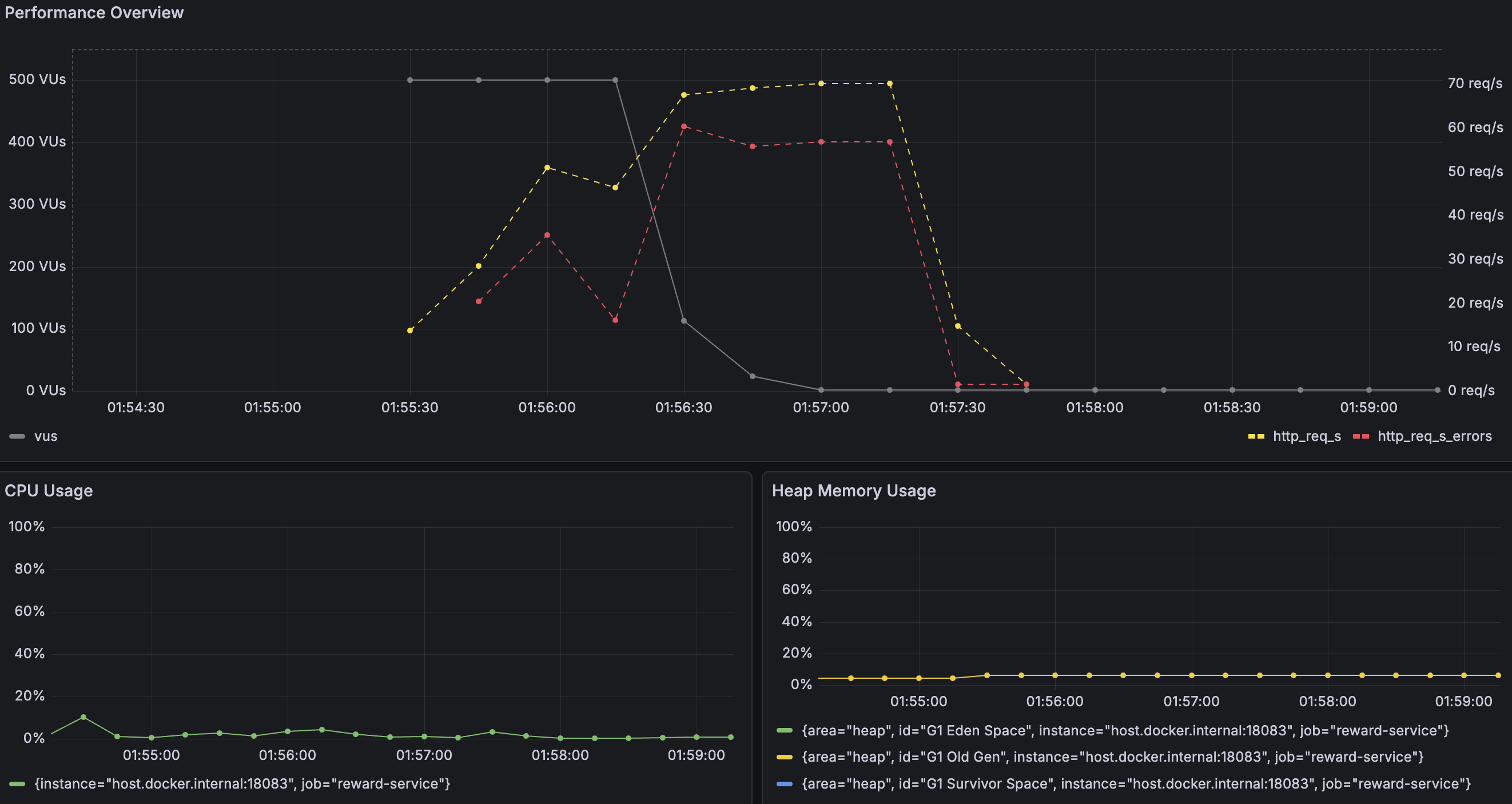 실제로 지표를 확인해 보면, 가상 유저 수와 TPS가 각각 500명, 160 req/s까지 올라갔다가 약 15초 만에 급격히 감소하는 것을 볼 수 있다.
