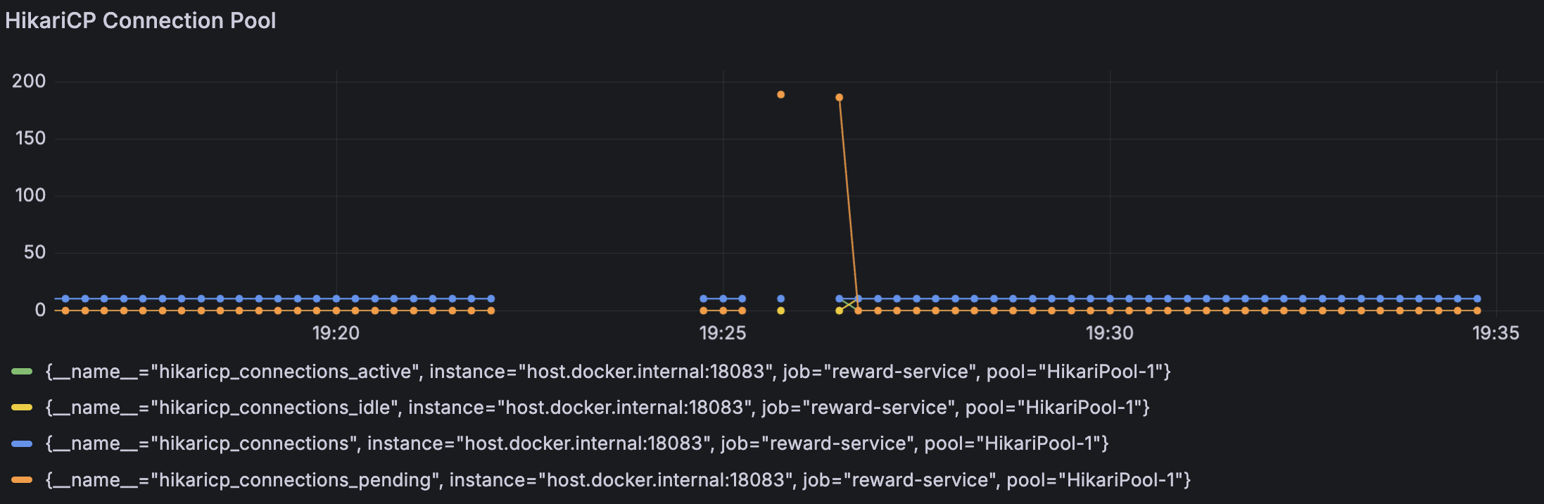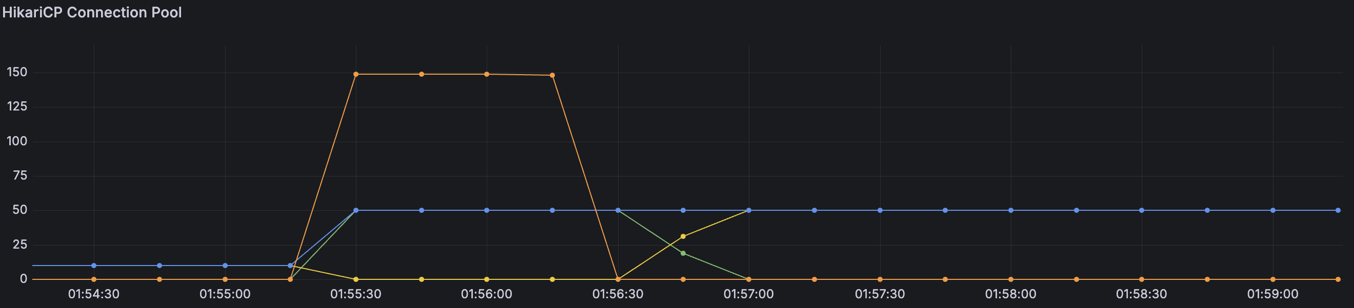 HikariCP 지표를 보면서 흥미로운 점이 있었다. 커넥션 풀의 최대 크기는 50개로 설정되어 있었지만, 분산 락 적용 후 실제로 사용된 커넥션 수는 10개 정도만 사용됐다.